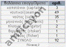 Εκτός των ναυτικών ή θαλάσσιων επαγγελμάτων (και των εργατών γης) δηλώθηκαν πολλά και ποικίλα διαφορετικά επαγγέλματα (βλ. Πίν. 3)